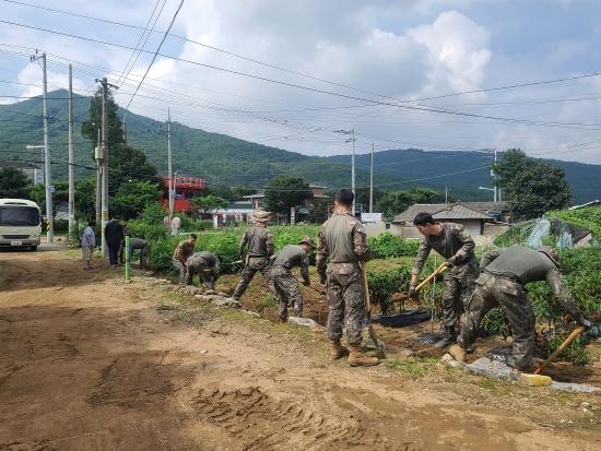 이번 활동에는 육군 제3015부대 장병 20여 명이 참여해 배수로, 마당 등에 쌓인 토사 제거, 무너진 둑 복구 등의 수해복구 작업을 전개했다.