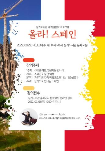 김포시 장기도서관은 오는 9월 22일 목요일 오후 2시부터 세계인문학 프로그램 ‘올라! 스페인’을 4주에 걸쳐 운영한다.