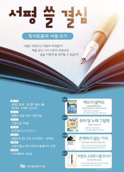고양시 대화도서관이 글쓰기 프로그램 '서평 쓸 결심'을 9월 6일부터 9월 27일까지 운영한다.