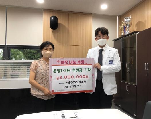 파주시 운정1·3동은 지난 18일 서울365외과의원에서 집중호우 피해 복구를 돕기 위한 성금 300만원을 기탁했다고 밝혔다.