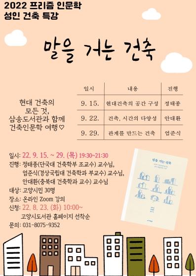 고양특례시 삼송도서관이 오는 9월 8일부터 9월 29일까지 올해 세 번째 프리즘 인문학 프로그램 ‘말을 거는 건축’을 운영한다.