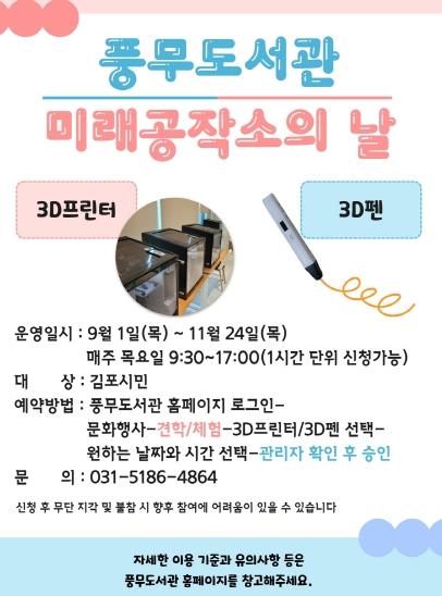 현재 미래공작소에는 3D프린터 4대(Sindoh 2X DP303), 3D펜 15대(손도리 3D펜 RP800A Mynt) 등의 장비를 보유 중이다. 각 장비의 사용 시간과 프로그램 등은 풍무도서관 홈페이지에서 확인할 수 있으며 김포시 시립도서관 홈페이지의 문화행사-견학/체험 탭을 통해 신청할 수 있다.