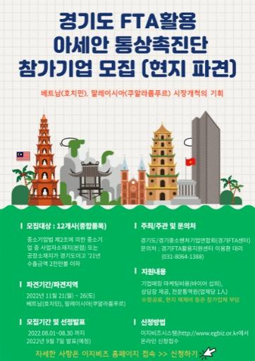 경기도와 경기FTA활용지원센터가 아세안 시장을 공략할 도내 중소기업을 오는 30일까지 모집한다.