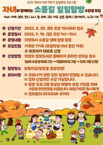 탐방은 오전 9시부터 12시까지 총 3시간 동안 진행되며, 수강 대상은 초등학생을 동반한 가족 7팀으로 운영된다. 수강 신청은 8월 30일 오전 10시부터 의정부정보도서관 홈페이지 책문화프로그램 코너에서 온라인 선착순 접수로 가능하다.