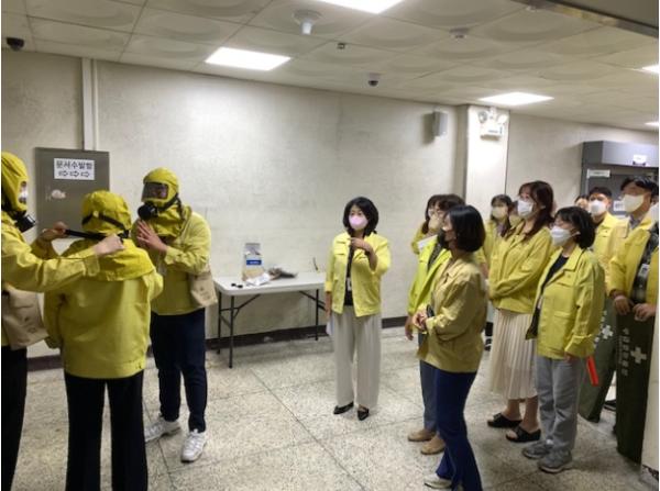 이날 자위소방대원으로 편성된 전 직원은 (준비) 대피장소 점검, 참가 임무 숙지, (훈련) 대피훈련, (교육) 적 미사일 공격 등 비상대비 행동요령과 화생방에 대비한 방독면 착용 방법 등 동영상 등으로 먼저 실시했다.