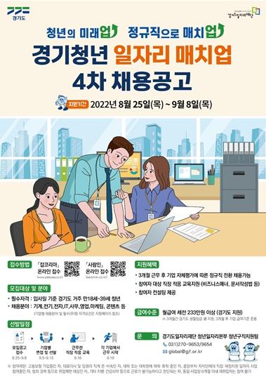 경기도는 ‘2022 경기청년 일자리 매치업 취업지원’ 4차 참여자 모집을 추진, 청년들의 일 경험 쌓기와 정규직 전환 돕기에 나선다고 25일 밝혔다.