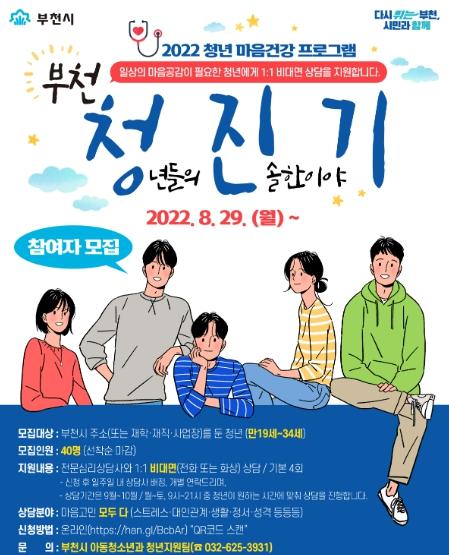부천시가 코로나블루, 취업률 감소 등으로 심리·정서적으로 지친 청년을 위해 2022년 부천 청년 마음건강 프로그램 ‘부천 청진기(청년들의진솔한이야기)’ 참여자 40명을 29일부터 선착순 모집한다.