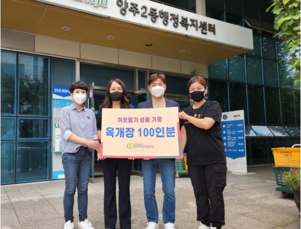 사회적협동조합 양주지역자활센터(센터장 최흥동)는 25일 양주2동 행정복지센터(동장 송미애)를 방문해 추석을 맞아 관내 어려운 이웃에게 전달해달라며 육개장 100인분을 기부했다.