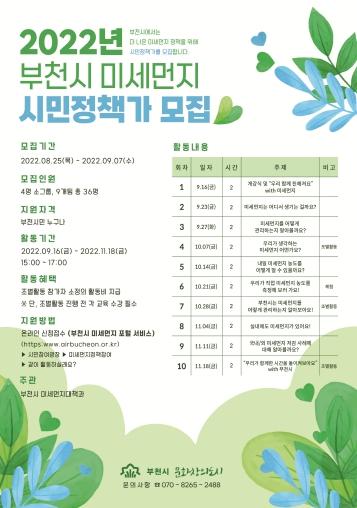 부천시는 부천시민을 대상으로 ‘2022 부천시 미세먼지 시민정책가 양성교육’ 참여자 36명을 모집한다.