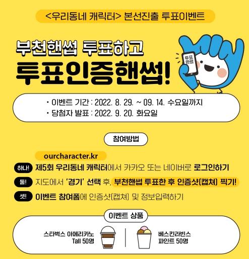 참여 방법은 부천시 페이스북 또는 네이버 브랜드 광고를 통해 ‘우리동네 캐릭터 홈페이지’ 접속 후, 부천핸썹 투표 인증샷을 이벤트 참여폼에 업로드하면 된다.