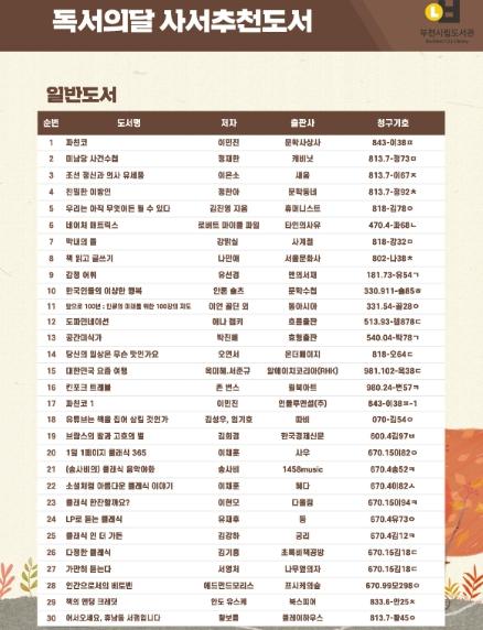 조용익 부천시장은 “도서관 추천도서를 통해 일상에서 독서를 가까이할 수 있는 계기가 되어 책읽기 좋은 계절 9월에 도서관에서 지식과 마음이 풍성해지길 바란다”고 전했다.
