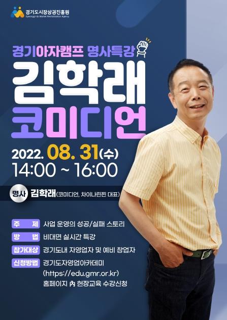 경기 아자캠프는 1차 차이나린찐 김학래(코디미언)대표의 강의주제 ‘사업 운영의 성공/실패 스토리’(8월 31일)를 시작으로 CBS 세바시(세상을 바꾸는 시간, 15분), tvN 어쩌다 어른, MBC 선을 넘는녀석들 등에서 명사로 출연한 김경일 교수의 ‘걱정 해결 테라피 특강’(9월 28일), 셰프출신의 유명 유튜브 채널(승우아빠) 운영자인 목진화 셰프의 ‘마케팅 특급 비법’(10월 25일) 등 총 4회에 걸쳐 운영된다.