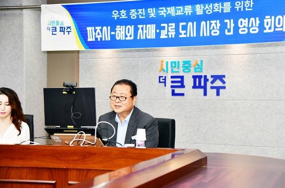 김경일 파주시장이 코로나19로 침체된 해외 도시와의 의사소통을 강화해 우호관계를 유지하고 새로운 교류협력 방안을 찾아 활성화하기 위해 해외 자매·교류도시의 시장들과 영상회의를 이어가고 있다.