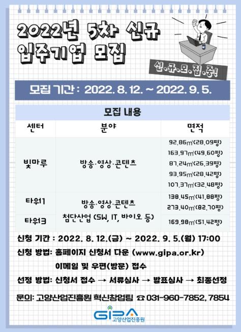 고양산업진흥원이 운영하는 기업입주시설에서 방송·영상, 콘텐츠, 바이오, ICT 등 첨단산업 분야의 기업을 대상으로 9월 5일까지 입주기업을 모집한다.