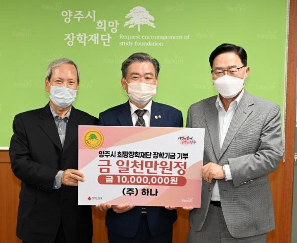 양주시 희망장학재단은 지난 30일 희망장학재단 사무국에서 양주지역산림조합 5백만원, (주)하나에서 경기사회복지공동모금회를 통해 1천만원을 지정기탁 했다고 밝혔다.