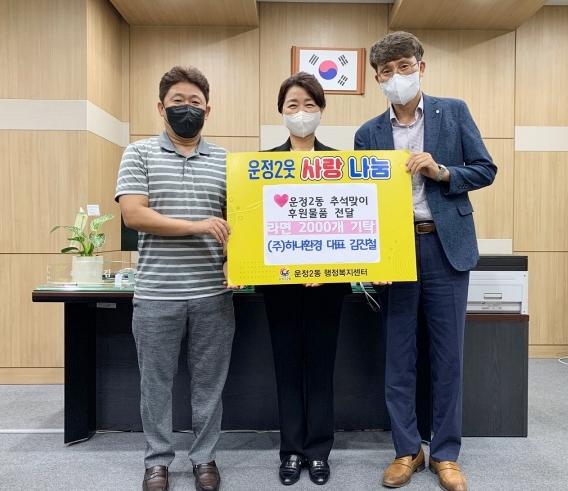 ㈜하나환경은 지난 30일 파주시 운정2동에 라면 2,000개를 기탁했다.