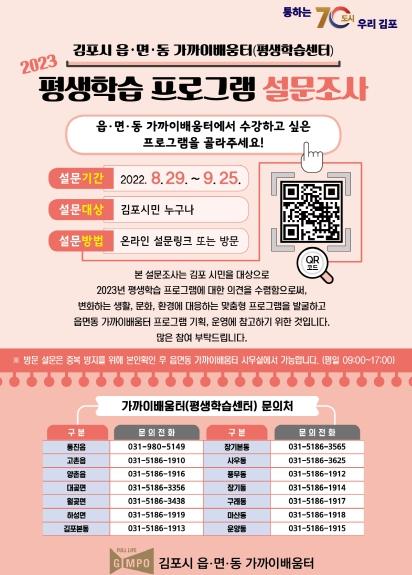 김포시는 오는 9월 25일까지 2023년 김포시 읍·면·동 가까이배움터(평생학습센터) 평생학습 프로그램에 대한 시민 의견을 수렴한다.