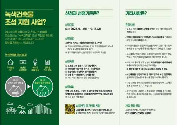 지원을 희망하는 대상자는 고양시 홈페이지 공고 및 새소식에 첨부된 관련서류를 내려 받아 작성 후 고양시청 녹색도시담당관 녹색건축팀(고양시 덕양구 마상로 126번길 91, 줌시티 404호)으로 9월 1일부터 9월 16일까지 방문 또는 등기 우편으로 제출하면 된다.