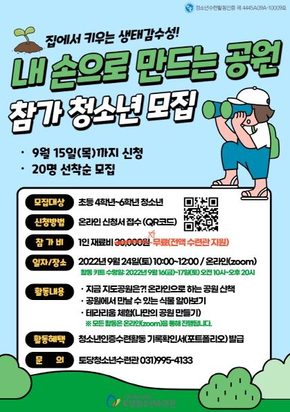 고양시청소년재단 토당청소년수련관은 코로나19 장기화로 야외활동이 위축되어있는 환경에서 청소년들이 안전하고 유익한 체험활동에 참여할 수 있도록 청소년수련활동인증프로그램 ‘내 손으로 만드는 공원’을 9월 24일(토) 10시부터 온라인(zoom)으로 진행한다.