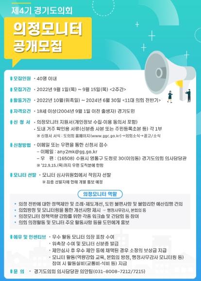 경기도의회는 의정활동에 필요한 도민의 다양한 의견을 수렴하고 소통하는 의회, 열린 의회 구현을 위해 제4기 의정모니터 40명을 공개 모집한다.