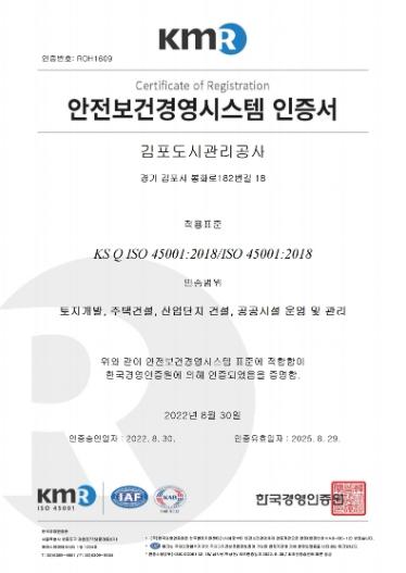 김포도시관리공사(사장 김동석)가 안전보건관련 국제표준인 안전보건경영시스템(ISO45001)인증을 획득했다고 밝혔다.