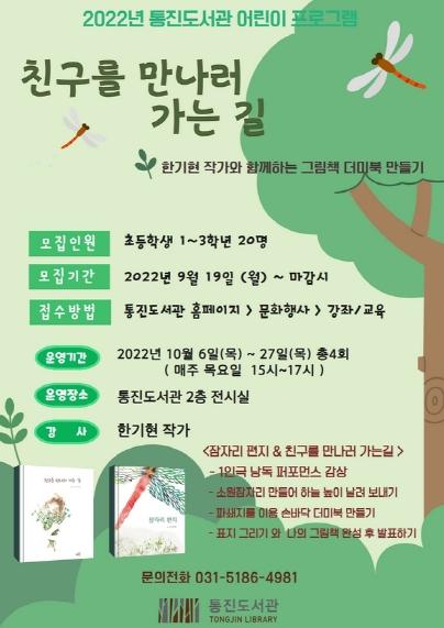김포시 통진도서관은 도서관 중장기 종합발전계획의 ‘생애주기별 평생학습 지원’ 실천 및 지역 특성에 따른 강좌 운영으로 어린이프로그램 한기현 작가와'친구를 만나러 가는 길'를 10월 6일부터 10월 27일 매주 목요일 오후 3시부터 5시까지 김포 초등 1학년부터 3학년을 대상으로 통진도서관 2층 전시실에서 운영한다.