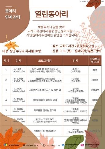 파주시 교하도서관은 동아리 활성화를 위해 도서관 소속 16개의 독서?문화동아리 모임 장소 대관 지원뿐 아니라 9월 독서의 달을 맞아 동아리 연계 강좌 ‘열린 동아리’를 14일(수)부터 시작한다고 밝혔다.
