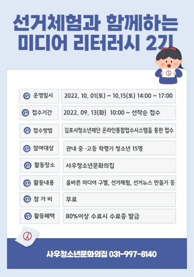 (재)김포시청소년재단 사우청소년문화의집에서는 관내 청소년들에게 선거과정속에서 찾는 올바른 미디어의 이해를 돕기 위한 특성화프로그램 ‘선거체험과 함께하는 미디어리터러시’ 2기를 운영한다.