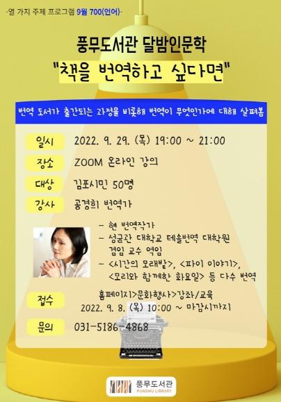 김포시 풍무도서관은 달밤인문학 '책을 번역하고 싶다면'을 2022년 9월 29일 목요일 오후 7시부터 9시에 비대면 줌으로 운영한다.