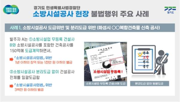 주요 사례를 보면 화성시 소재 복합건축물 신축공사현장 발주자 ‘A’는 소방시설공사업자가 아닌 종합건설사 ‘B’에게 소방공사를 포함한 건축공사 전체를 150억 원에 도급계약해 소방시설공사 도급위반과 분리도급 위반으로 적발됐다.