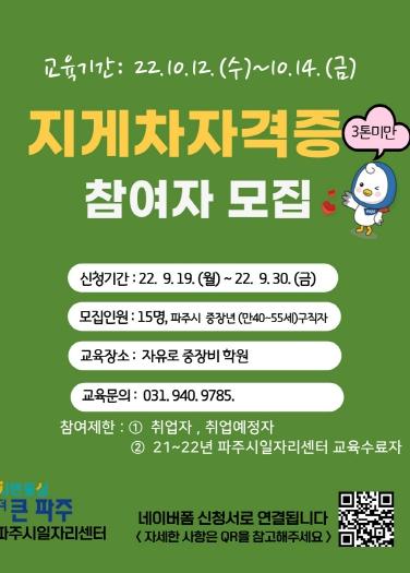 파주시는 코로나19로 인한 취업난 대응과 건설업 및 물류 분야 구직난을 해소하기 위해 오는 19일부터 30일까지 ‘3톤 미만 지게차 조종교육’ 참여자 15명을 모집한다.