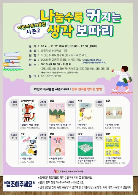 고양특례시 화정어린이도서관이 10월 4일부터 11월 22일까지 온라인 어린이 독서클럽 '나눌수록 커지는 생각 보따리 시즌2'을 운영한다.