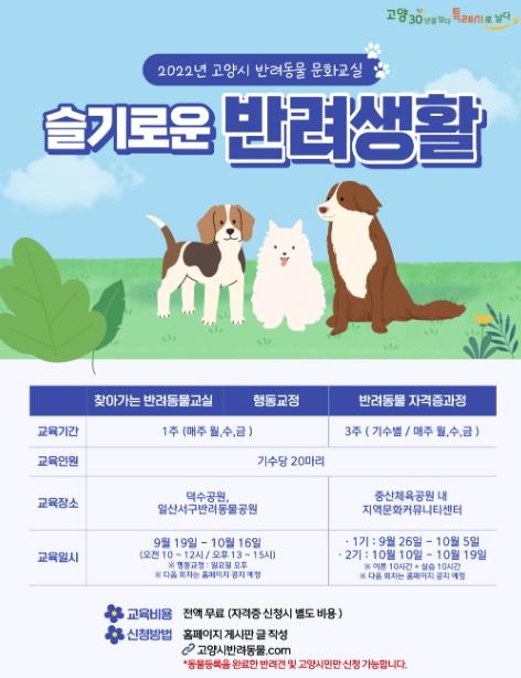 고양특례시가 성숙한 반려동물 문화 정착을 위해 ‘2022년 고양시 반려동물 문화교실’을 운영한다.