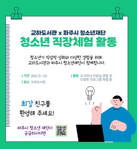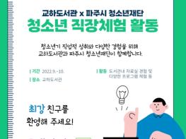 파주시 교하도서관은 9월부터 10월까지 파주시 청소년재단과 연계해 ‘청소년 자립지원 직장체험’을 운영한다.