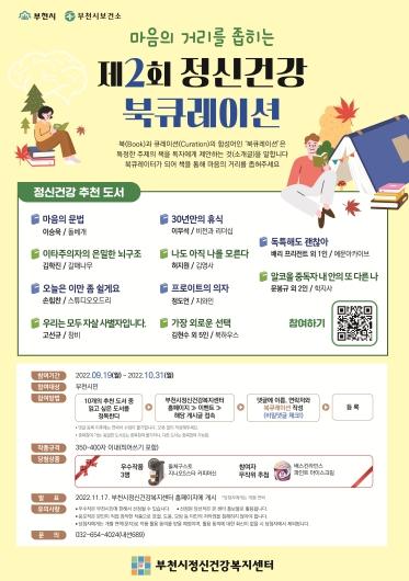 부천시보건소와 부천시정신건강복지센터는 지역사회 내 정신건강 감수성을 높이고 정신질환에 대한 사회적 인식을 개선하고자 2022년 정신건강 문화행사 ‘제2회 마음의 거리를 좁히는 정신건강 북큐레이션’을 개최한다.