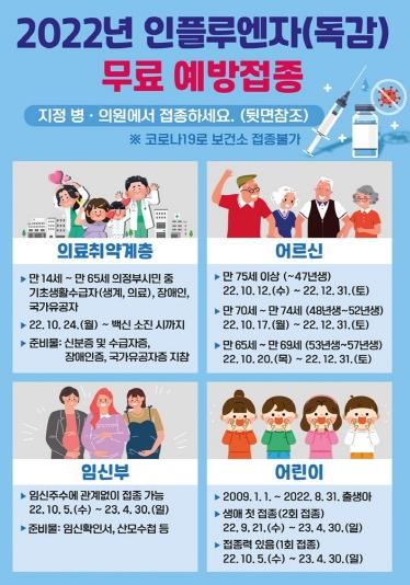 의정부시 보건소는 올해 코로나19와 인플루엔자 동시 유행 상황에 대비하기 위해 합병증 및 입원·사망 위험이 큰 만 65세 이상 어르신, 어린이, 임신부에 대해서 인플루엔자(독감) 무료접종을 지원한다고 밝혔다.