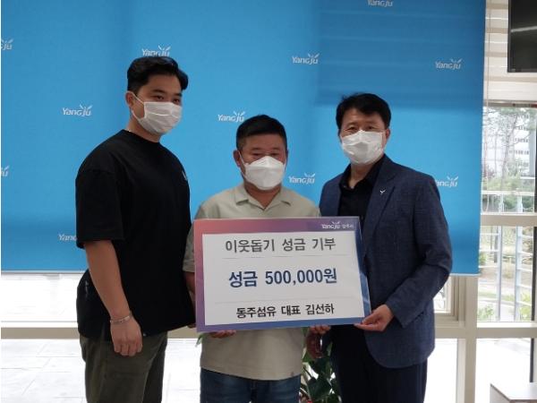 양주시 회천4동 행정복지센터(동장 이창열)는 지난 15일 율정동 소재 동주섬유(대표 김서하)에서 주위 어려운 이웃을 위해 써달라며 성금 50만원을 기부했다고 밝혔다.