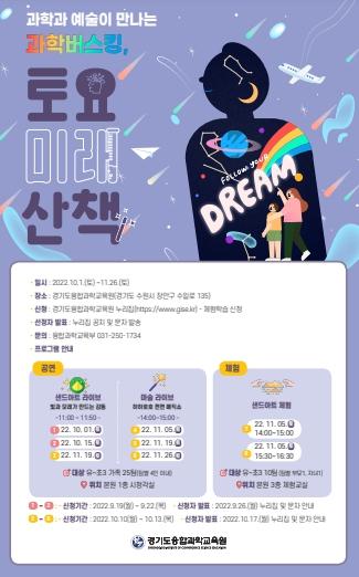 경기도융합과학교육원(원장 강심원)은 19일부터 유아와 초등학생을 포함한 가족을 대상으로 융합과학 교육 문화 확산을 위한 하반기 ‘토요미래산책’ 참가 신청을 받는다.