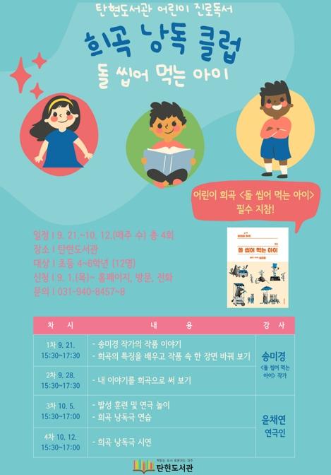 파주시 탄현도서관은 오는 21일부터 10월 12일까지 매주 수요일에 어린이 진로독서 프로그램인 ‘희곡 낭독 클럽: 돌 씹어 먹는 아이’를 운영한다.