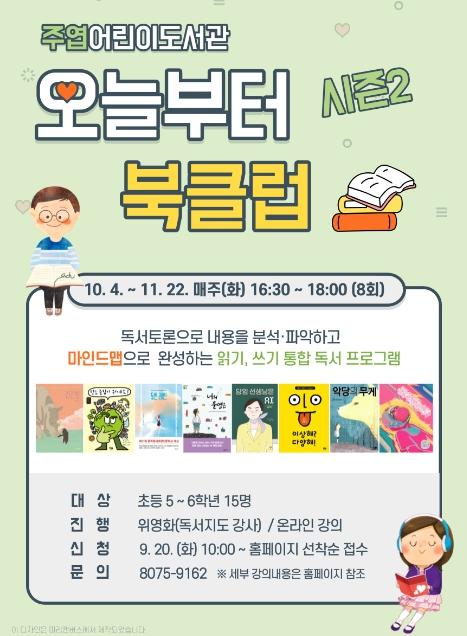 고양특례시 주엽어린이도서관이 오는 10월부터 어린이 독서토론 프로그램 '오늘부터 북클럽 시즌2'를 운영한다.