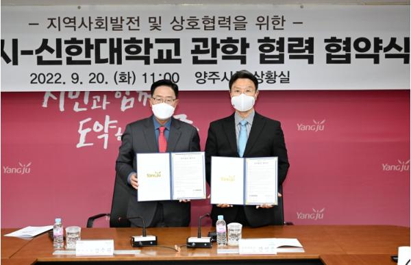 양주시는 20일 시청 상황실에서 신한대학교(총장 강성종)와 지역발전과 대학의 경쟁력 확보를 통한 사회적 가치 창출을 위한 관·학 협력 협약식을 체결했다.