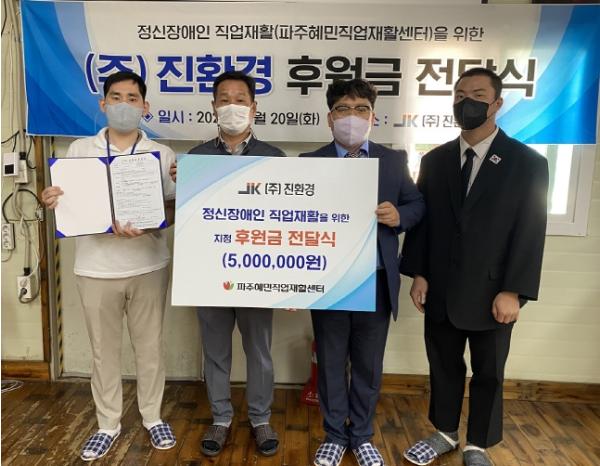 파주시는 ㈜진환경가 지난 20일 정신장애인 및 정신질환자의 직업재활 시설인 파주혜민직업재활센터에 5백만원의 후원금을 전달했다고 밝혔다.