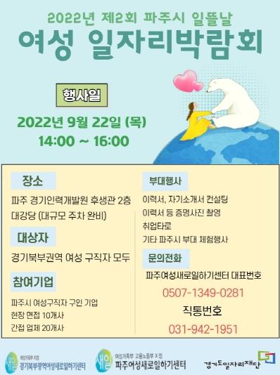 파주시는 경기도일자리재단에서 파주여성새로일하기센터와 오는 22일 파주 경기인력개발원에서 하반기 여성취업박람회 ‘일뜰날’을 개최한다고 밝혔다.