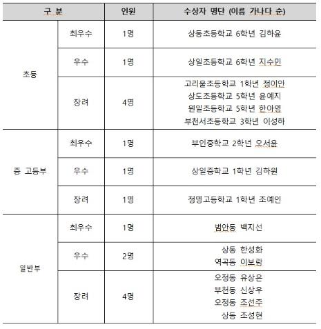 심사 결과, 초등부 최우수상은 상동초등학교 6학년 김하윤, 중고등부 최우수상은 부인중학교 2학년 오서윤, 일반부 최우수상은 범안동에 거주하는 백지선님이 선정됐다.