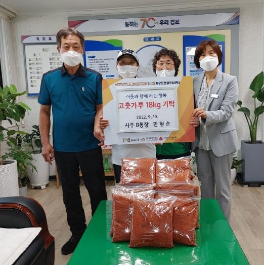 사우동행정복지센터는 지난 19일 민현순 통장(사우8통)이 사우동 남녀새마을지도자협의회에 손수 땀흘려 키운 고추로 빻은 고춧가루 18kg를 기탁했다고 밝혔다.