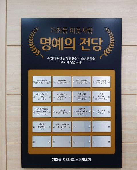 명예의 전당에 새겨 진 후원자는 가좌동 지역사회보장협의체의 특화사업을 후원하는 지역 내 기업, 소상공인 및 개인 기부자들로서 어려운 이웃에 나눔의 소중함을 몸소 실천하는 우리의 이웃들이다.