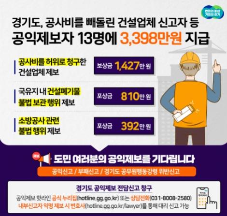 경기도가 공익제보를 통해 도가 발주한 공사를 도급받은 하도급업체의 공사비 과다 보고를 적발하고 이들 업체를 사기 혐의로 경찰에 수사 의뢰했다. 공익제보자에게는 보상금 1,427만 원을 지급하기로 결정했다.