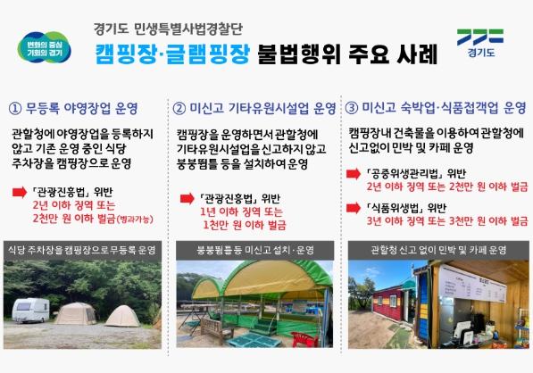 경기도 특별사법경찰단은 지난 8월 29일부터 9월 2일까지 도내 캠핑장과 글램핑장 20곳을 단속한 결과 관광진흥법 등을 위반한 10곳(11건)을 적발했다고 22일 밝혔다.