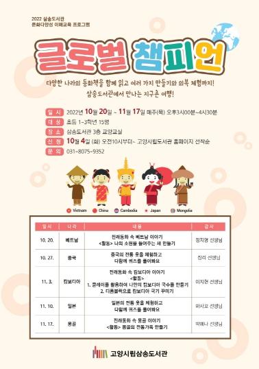 고양특례시 삼송도서관에서 초등학교 1~3학년을 대상으로 10월 20일부터 11월 17일까지 문화 다양성 이해교육 프로그램 ‘글로벌 챔피언’을 운영한다.