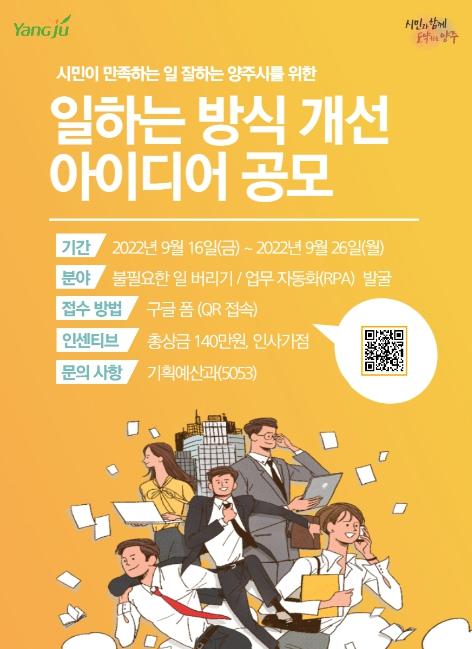 양주시는 시민 중심의 일 잘하는 공직사회를 구현하기 위해 전 직원을 대상으로 오는 26일까지 ‘일하는 방식 개선 아이디어’공모전을 개최한다.